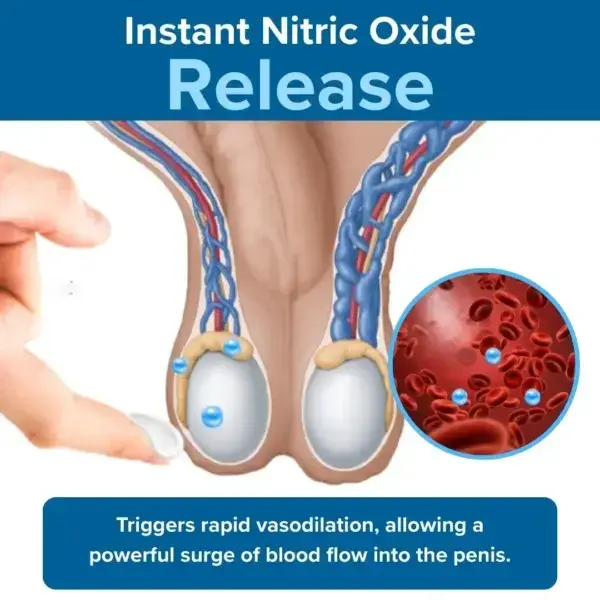 Triggers rapid vasodilation, allowing a powerful surge of blood flow into the penis.